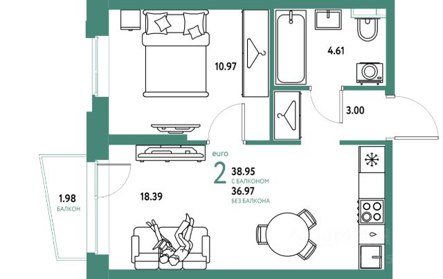 * Удобная планировка: кухня-гостиная 15,3 кв.м и комната 10,2 кв.м.