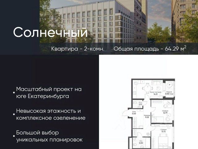 Продается квартира 294, по адресу Свердловская обл., г. Екатеринбург, ул. Счастливая, корпус Солнечный, блок 11.2 в Солнечный на 14 этаже, с площадью 61.8 м2.