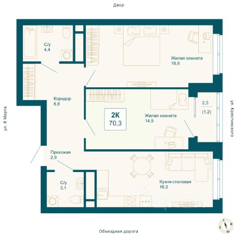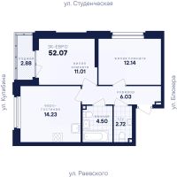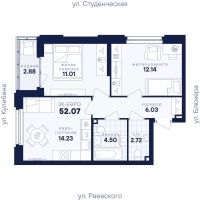 Квартира общей площадью 91,2 кв. м: большая светлая кухня-гостиная - 30,2 кв. м с выходом на лоджию, две спальни - 21 и 16,3 кв. м, прихожая и коридор - 17,2 кв. м, два санузла, кладовая.