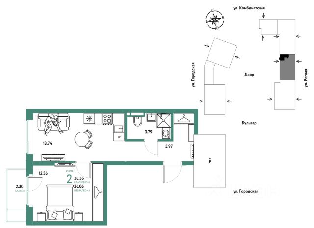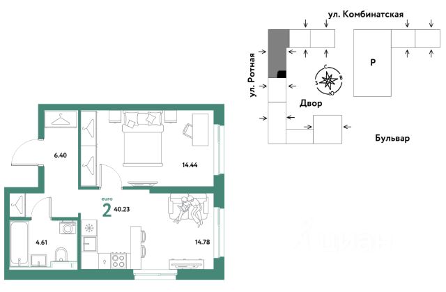 2комнатная квартира площадью 40,23кв. м. на 15 этаже жилого комплекса "Уральский сад".