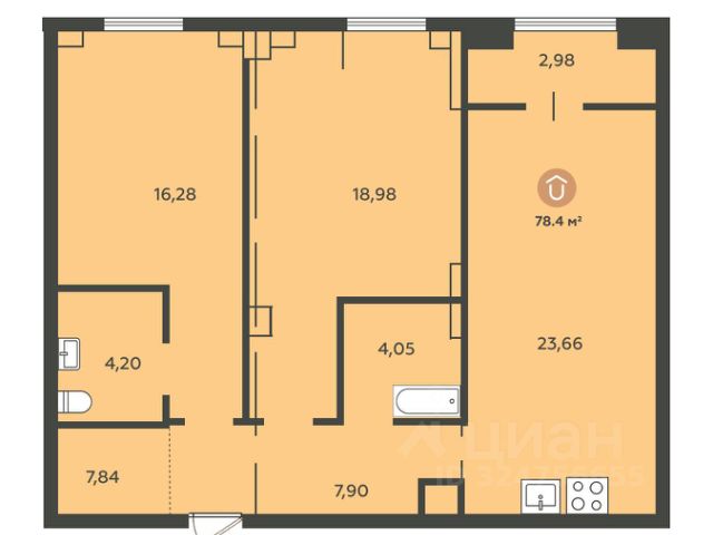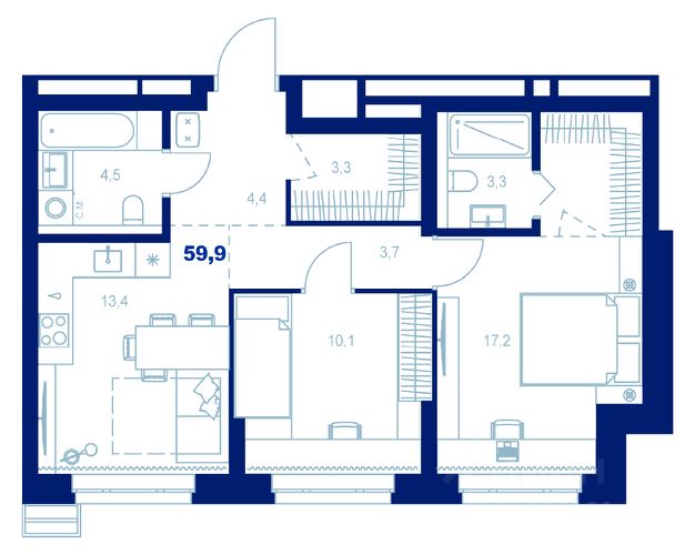 Функциональная планировка: большая кухня-гостиная (17,6 кв.м.) с выходом на застекленную лоджию идеальное место для семейных ужинов и приема гостей, а также две изолированные спальни (11 и 14 кв.м.)