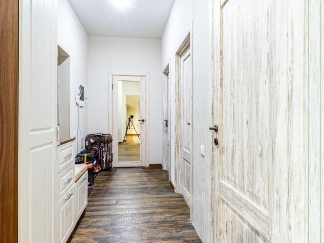 Качественный ремонт. Натяжные потолки, ламинат высшего класса, стены с красивыми светлыми обоями, современные межкомнатные двери. Все продумано до мелочей!