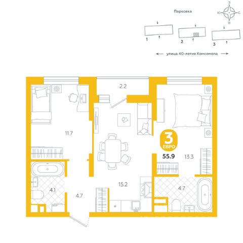Двухкомнатная квартира с грамотной организацией пространства, которое работает по принципу умного дизайна — выверенные решения для динамичного образа жизни. Здесь удачно сочетаются приватность и современная эргономика: изолированные спальни, уютная кухня с удобной рабочей зоной и практичные системы хранения — эффект упорядоченного простора обеспечен. Квартира располагается в ЖК "Комсомольский" — жилом комплексе комфорт-класса. Здесь вы будете наслаждаться беззаботной жизнью, ведь ваш дом — воплощение практичности, безопасности и надежности. Для удобства предусмотрены колясочные на первых этажах домов, где можно оставить велосипеды и коляски в тепле. За безопасность отвечают система электронных ключей и видеонаблюдение. Еще здесь собственная котельная, поэтому в доме всегда будут горячая вода и оплата счетов только за фактически потребленное тепло. ПРЕИМУЩЕСТВА ЖК На этаже 15 квартир Красивые и функциональные парадные с мягкой и стильной зоной для отдыха, книгообменником, встроенными почтовыми ящиками и нишами для сумок Колясочные с доступом по ключу IP-домофоны Тихие лифты с плавным ходом О ПРОЕКТЕ ЖК "Комсомольский" строится в спокойном Кировском районе Екатеринбурга в границах улиц Сыромолотова — Рассветная — 40-лет Комсомола. Комплекс состоит из трех домов переменной этажности, которые выделяются динамичными линиями, выразительными фасадами и стильными лоджиями. ЛОКАЦИЯ Всё, что необходимо для повседневной жизни, находится недалеко от дома: школы, детские сады, продуктовые магазины, фитнес-клубы. Дорога до центра города на машине займет всего 10 минут — достаточно повернуть с улицы 40-летия Комсомола на улицу Владимира Высоцкого. Рядом с этим перекрестком начинается "Тропа здоровья" — большой терренкур вдоль "Каменных палаток". 10 мин до центра 3-4 минуты до школы No 82, гимназии No 176 4-5 минут до детских садов No 208, No 583, 266 20 мин до Свердловского областного медицинского колледжа и Центральной городской больницы No 7 В рамках стратегического развития района на первых этажах домов появятся коммерческие помещения, в которых откроются магазины и кафе. Следует учесть, что к 2030 году в Кировском районе планируется формирование регионального рекреационно-оздоровительного кластера, строительство ветки метро, расширение и модернизация старых промышленных зон социальной и бизнес-инфраструктуры, что приведет к созданию комфортной среды для жизни. Кроме того, в стратегию входит развитие Шарташского лесного парка как центра регионального и международного туризма. СПОСОБЫ ПОКУПКИ Ипотека: подберем выгодные условия в нескольких банках, чтобы вы могли выбрать лучшее Материнской капитал: можно использовать в качестве первоначального взноса Рассрочка: платите частями без % Сертификаты: позволяют оплатить часть стоимости квартиры О КОМПАНИИ "Паритет Девелопмент" — это современный и ответственный подход к реализации проектов в сфере жилищного строительства. Компания формирует среду, способную создать новое качество жизн