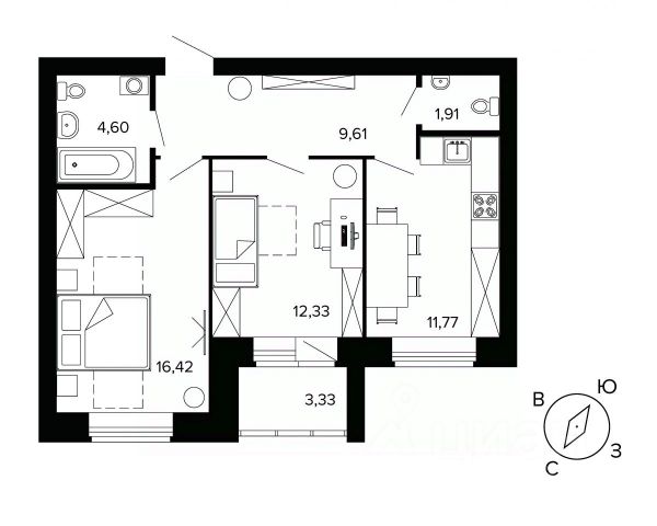 • Мебель в сан.узле: унитаз компакт или инсталляция, акриловая ванна, раковина, тумба