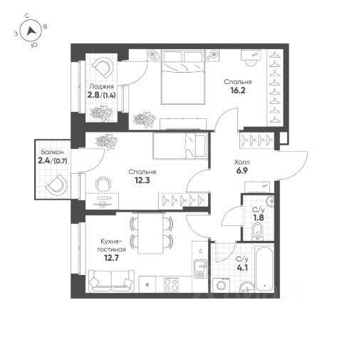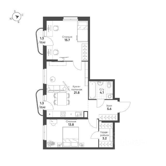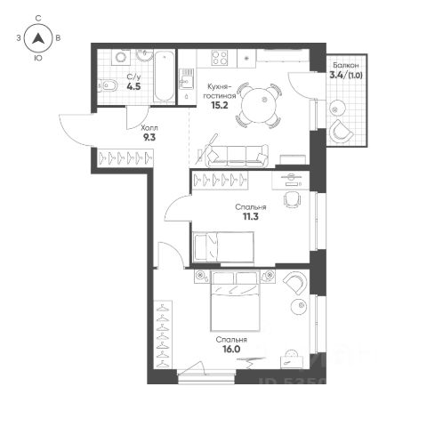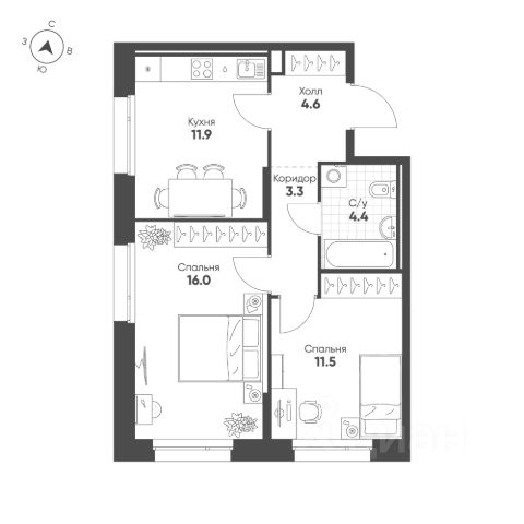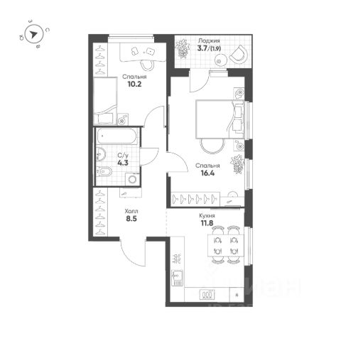 Общая площадь квартиры составляет 44,1 кв. м, из которых 14.65 кв. м — жилая площадь, 21.13 кв. м — кухня-гостиная, санузел -4.03 м, лоджия-3.55,прихожая -4.48. Высота потолков — 2,7 м, что создаёт ощущение простора и свободы. В квартире сделан качественный чистовой ремонт от застройщика.