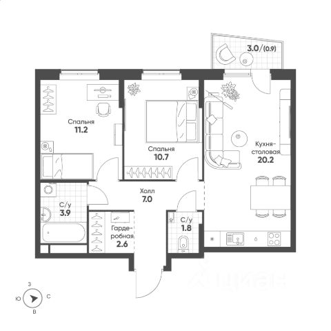 Новым собственникам остаётся кухонный гарнитур, шкаф-купе в спальне, шкаф-купе в прихожей, мебель в ванной, холодильник, стиральная машина, двухспальная кровать, диван.