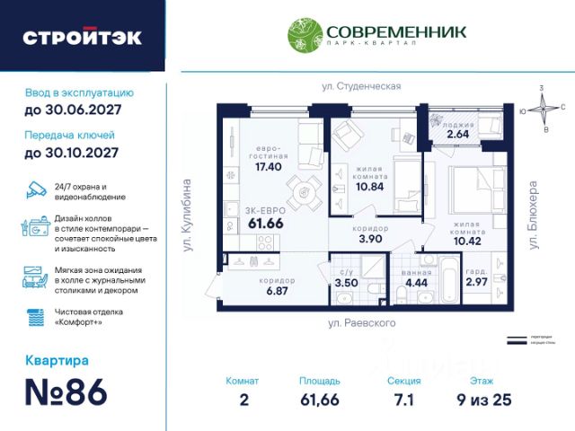 Время жить счастливо Современник — знаковый парк-квартал в интеллигентном районе Втузгородок, откуда недалеко до центра, а вблизи ведущие вузы и театры. Квартал состоит из 8 очередей строительства. Шесть очередей уже сданы и заселены; седьмая строится. В продаже квартиры от застройщика: 1 этап седьмой очереди. Объединяет квартал большой внутренний парк площадью в гектар — богатый прогулочными маршрутами, тенистыми деревьями, пространствами для отдыха, спорта и детских игр. С внешней стороны, у домов седьмой очереди, появится гостевой центр. Проект создавали в KCAP Architects and Planners, архитектурном бюро из Нидерландов, чьи работы украшают ландшафты Гамбурга, Антверпена и других городов Европы. Технологии, продуманное пространство и трендовый облик зданий создают размеренную атмосферу для жизни здесь. Достойное окружение До проспекта Ленина на машине вы доберётесь за 10 минут, а с другой стороны, неподалёку — Шарташский лесопарк с озером Шарташ, которому около миллиона лет. Здесь для вас пляжи, лодочные станции, тропы для бега и кафе. В квартале уже работают супермаркеты, пекарни, салон красоты и не только. Ближние школы, гимназии и университеты помогут расправить крылья новым поколениям, а детские сады станут заботливой средой в начале пути. Кстати, на территории квартала спроектирован муниципальный детский сад на 200 мест. Выходите во двор Гуляйте по зелёным аллеям или устройтесь с книгой в гамаке. Займитесь воркаутом, футболом, баскетболом или пинг-понгом. Проводите семейные праздники под крытым амфитеатром или отправьте детей играть на насыщенный плейхаб. Мы всё предусмотрели. На закрытой территории без машин и посторонних спокойно и безопасно. Видеонаблюдение и освещение добавляют ещё больше уверенности. Впечатляющая доминанта у домов 7 очереди — новый гостевой центр: камерное пространство под навесом-перголой с озеленением и скамейками, чтобы встречать друзей. Ваша зона комфорта Стильное лобби Современника мы выполним в эстетике contemporary: минимализм, сочетание дерева со штукатуркой и тёмным металлом, зеркала, витражи. Обстановка из мягкой мебели, растений и книг. Двери из холла выходят на обе стороны. Внутри — комната для колясок и самокатов. На -1 этаже подземный паркинг с 201 машино-местом, куда легко попасть на лифте прямо с вашего этажа. Здесь же можно приобрести одну из 67 кладовых, чтобы хранить сезонный инвентарь. СТРОЙТЭК возводит 7 очередь в 3 этапа. Дом с привилегиями Первый этап — секция 7.1, башня в 25 этажей. Здесь 246 квартир в 19 уникальных планировках от студий до 3-комнатных, в классических и евро-вариантах. Просторные кухни-гостиные, гардеробные и окна на 2 стороны — лишь часть их плюсов. В Современнике улучшенный стандарт отделки "Комфорт +". Помимо комфортных сантехники и электрики, в него входят оконные стёкла Energy Light, которые помогают сохранять температуру, прочный ламинат 33 класса и устойчивые к многократной покраске виниловые обои. Белые межкомнатные двери и плинтусы подчеркнут любую цветовую гамму.