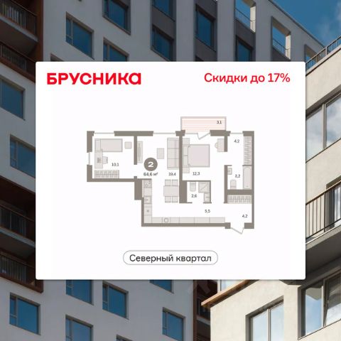 Квартира с кухней-гостиной и двумя спальнями в квартале "Траектория". Особенности планировки: второй санузел, гардеробная, лоджия, потолки 3 м и выше, предчистовая отделка, разнесённые спальни.