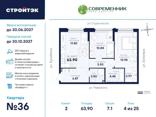 Ввод в эксплуатацию: вторая половина 2025 года (возможен досрочный ввод). Класс дома: комфорт. Отделка: чистовая. Вид из окон: на центр города и озеро Шарташ. Б.26 дом на высоте современный жилой комплекс в районе Втузгородок (пересечении улиц Блюхера и Мира). До центра города 20 минут ходьбы. В шаговой доступности находятся: ВУЗы (Уральский федеральный университет, Юридическая академия) Дендрологический парк. школы (Гимназии 35, 47, 108, Лицей 130) детские сады ( 421, 423, 332, 352) остановки общественного транспорта (ул. Мира, ул. Блюхера, ТК Современник). торговые центры (Апельсин, Современник, Галерея 11, Blissco молл) Современная архитектура. Долговечные фасады из навесных панелей и штукатурки, увеличенные окна и французские балконы формируют уникальный узнаваемый образ. Ночная подсветка выделяет дом среди застройки района и подчеркивает выразительность его силуэта. Двор без машин. Игровые площадки для детей разных возрастов, места отдыха и занятий спортом для взрослых не соседствуют с парковкой. Динопарк. Игровые зоны созданы в стиле таинственного мира динозавров. Парк во дворе. Многоуровневое озеленение c прогулочными дорожками, беседками и качелями. Три уровня безопасности. Контроль доступа по карте жителя, эффективная система видеонаблюдения, консьерж-сервис. Дизайнерские холлы. Парадный холл с остеклением в пол, зонами ожидания, гостевым санузлом и санузлом для мытья лап животным, а также колес велосипедов и колясок. Сервисная компания от застройщика. Обслуживанием дома будет заниматься профессиональная команда. Строительные и технические преимущества. Индивидуальный тепловой пункт: снижает затраты на отопление. Система очистки улучшит качество воды в доме. Пятикамерные окна задержат шумы и холод. Клапан вентиляции позволит проветрить комнату, не устраивая сквозняк. Горизонтальная разводка отопления: трубы спрятаны в полу. Счетчики с телеметрией. Отдельный счетчик на отопление у каждой квартиры. Отведение конденсата для кондиционеров. Высокий уровень шумоизоляции у стены квартир. Бесшумные, скоростные лифты.