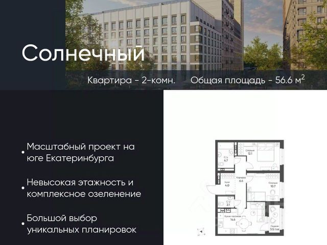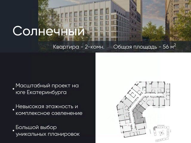 Продается квартира 165, по адресу Свердловская обл., г. Екатеринбург, ул. Счастливая, корпус Солнечный, блок 11.2 в Солнечный на 2 этаже, с площадью 61.6 м2.