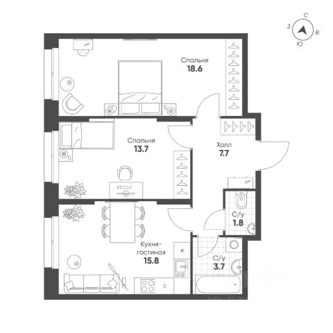 Комнаты большие, изолированные, правильной прямоугольной формы.