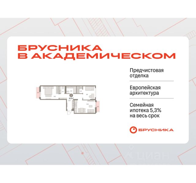 Квартира с кухней-гостиной и двумя спальнями в Бруснике в Академическом. Особенности планировки: окна на две стороны, второй санузел, гардеробная, вид во двор, разнесённые спальни, предчистовая отделка, балкон.