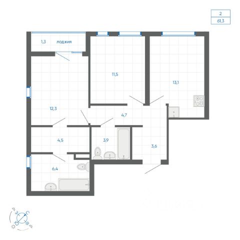 Квартира с кухней-гостиной и двумя спальнями в квартале "Траектория". Особенности планировки: второй санузел, гардеробная, стартовая цена, лоджия, разнесённые спальни, предчистовая отделка.