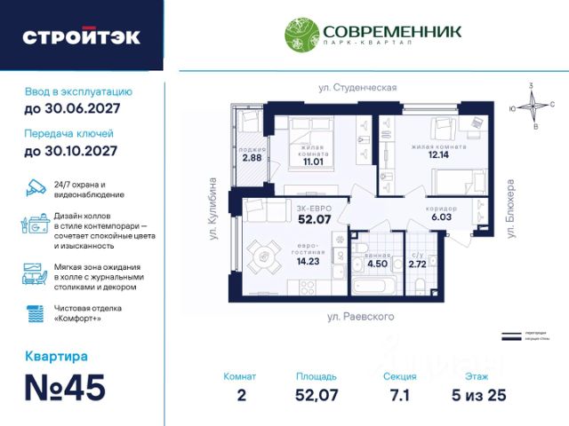 Ввод в эксплуатацию: вторая половина 2025 года Класс дома: комфорт. Отделка: чистовая. Вид из окон: на центр города и озеро Шарташ. Б.26 дом на высоте современный жилой комплекс в районе Втузгородок (пересечении улиц Блюхера и Мира). До центра города 20 минут ходьбы. В шаговой доступности находятся: ВУЗы (Уральский федеральный университет, Юридическая академия) Дендрологический парк. школы (Гимназии 35, 47, 108, Лицей 130) детские сады ( 421, 423, 332, 352) остановки общественного транспорта (ул. Мира, ул. Блюхера, ТК Современник). торговые центры (Апельсин, Современник, Галерея 11, Blissco молл) Современная архитектура. Долговечные фасады из навесных панелей и штукатурки, увеличенные окна и французские балконы формируют уникальный узнаваемый образ. Ночная подсветка выделяет дом среди застройки района и подчеркивает выразительность его силуэта. Двор без машин. Игровые площадки для детей разных возрастов, места отдыха и занятий спортом для взрослых не соседствуют с парковкой. Динопарк. Игровые зоны созданы в стиле таинственного мира динозавров. Парк во дворе. Многоуровневое озеленение c прогулочными дорожками, беседками и качелями. Три уровня безопасности. Контроль доступа по карте жителя, эффективная система видеонаблюдения, консьерж-сервис. Дизайнерские холлы. Парадный холл с остеклением в пол, зонами ожидания, гостевым санузлом и санузлом для мытья лап животным, а также колес велосипедов и колясок. Сервисная компания от застройщика. Обслуживанием дома будет заниматься профессиональная команда. Строительные и технические преимущества. Индивидуальный тепловой пункт: снижает затраты на отопление. Система очистки улучшит качество воды в доме. Пятикамерные окна задержат шумы и холод. Клапан вентиляции позволит проветрить комнату, не устраивая сквозняк. Горизонтальная разводка отопления: трубы спрятаны в полу. Счетчики с телеметрией. Отдельный счетчик на отопление у каждой квартиры. Отведение конденсата для кондиционеров. Высокий уровень шумоизоляции у стены квартир. Бесшумные, скоростные лифты.