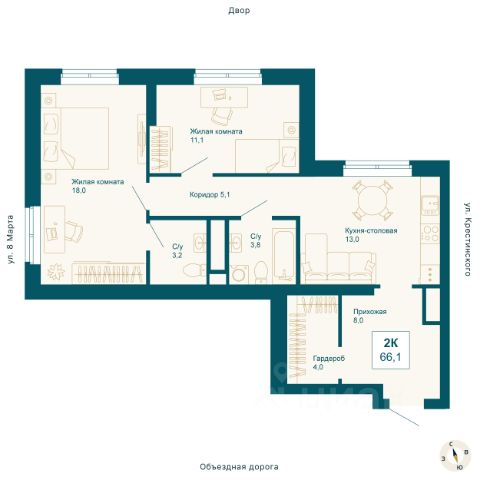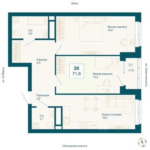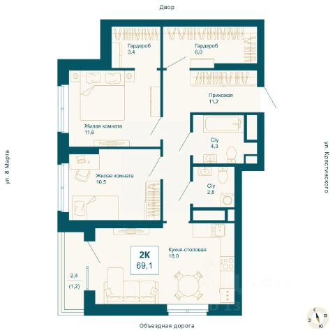 Квартира общей площадью 91,2 кв. м: большая светлая кухня-гостиная - 30,2 кв. м с выходом на лоджию, две спальни - 21 и 16,3 кв. м, прихожая и коридор - 17,2 кв. м, два санузла, кладовая.