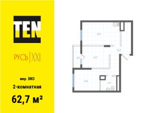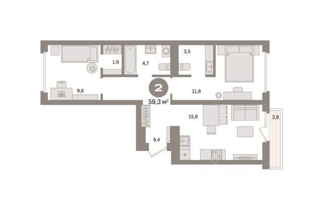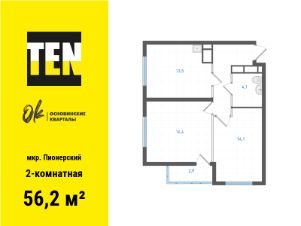 2-комн. квартира от застройщика с предчистовой отделкой в ЖК "Квартал Траектория" на 2 этаже. Общая площадь: 56.9 кв.м., жилая: 18.8 кв.м., площадь просторной кухни-столовой: 17.3 кв.м. Комнаты изолированные, все окна выходят на одну сторону. В квартире одна лоджия, два совмещенных санузла. Высота потолков 2.82 м.