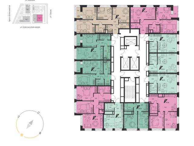 Квартира общей площадью 74 кв. м: удобная кухня - 10,8 кв. м, гостиная - 17,8 кв. м с выходом на балкон, большая спальня - 23,9 кв. м, просторный коридор с прихожей - 15,7 кв. м, санузел раздельный. Высота потолков - 2,77 м.