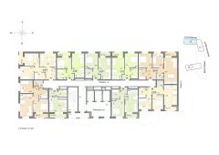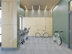 На первом этаже есть детская комната и коворкинг. Пока малыши играют, родители могут заняться текущими рабочими вопросами или просто отдохнуть. Также есть зона с пуфиками и телевизором. В каждой секции предусмотрены колясочные, чтобы жители могли комфортно распоряжаться пространством.