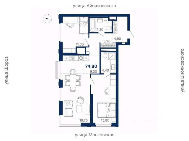 Функционал квартиры: удобная входная группа 8 кв.м, просторная кухня-гостиная 29,87 кв.м, рабочая зона кухни 6 кв.м, уютная спальня 24,48 кв.м, утепленная лоджия, где прекрасно вписывается рабочий кабинет, домашняя библиотека или туалетный столик 4,26 кв.м, вместительная гардеробная 2 кв.м и лоджия с панорамным остеклением 6,23 кв.м.