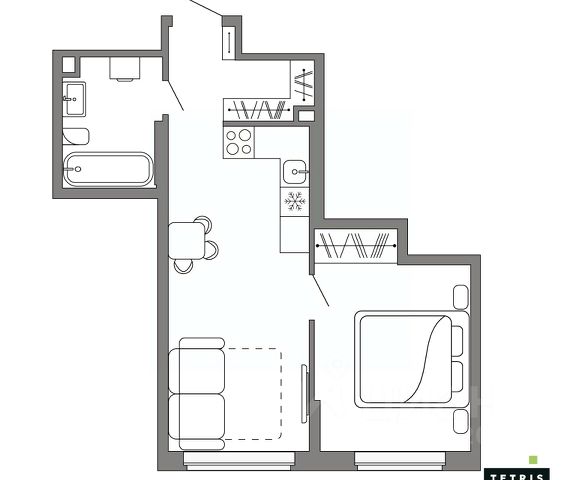 Квартира оборудована мебелью и техникой, все в едином современном стиле. В стоимость входит кухонная мебель с техникой, шкафы.