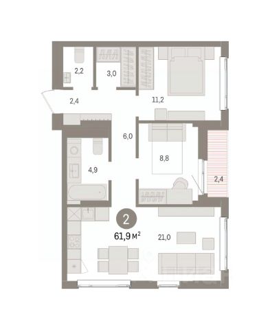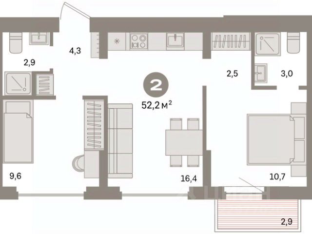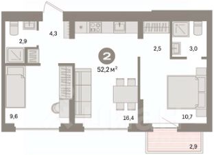 Квартира с кухней-гостиной и двумя спальнями в квартале "Траектория". Особенности планировки: окна на две стороны, гардеробная, стартовая цена, разнесённые спальни, предчистовая отделка, мастер-спальня, балкон.