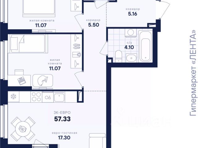 • ✅ Минимальная площадь: 51,3 м²