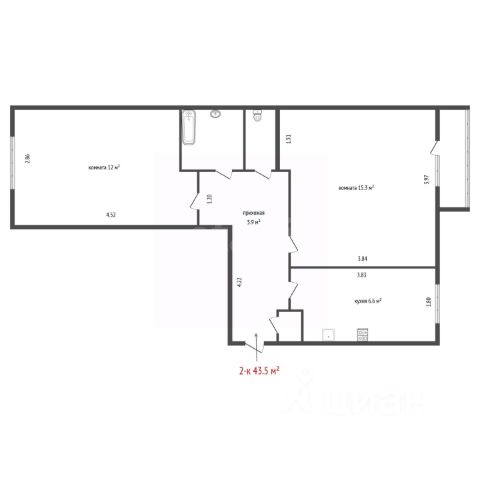 Кухня 5.9 м2, комната 19.8м2, коридор значительно большой по площади 3.8 м2, санузел у нас совмещённый 4 м2.