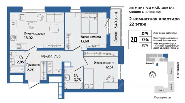 Продается 2 к квартира 62 в жилом комплексе МирТрудМай 4Б