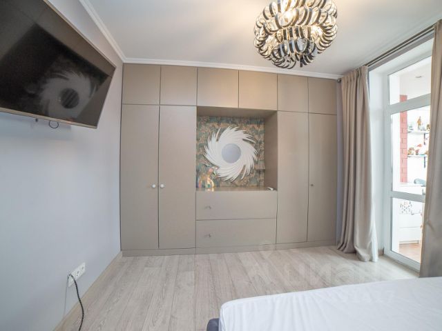 - кровать и тумбы с комодом, шкаф в спальне, люстры.