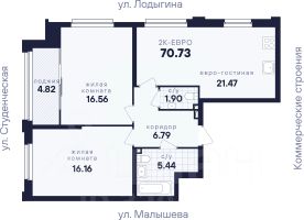 Квартира общей площадью 68,1 кв. м: просторная кухня-столовая - 17,1 кв. м, гостиная - 20,1 кв. м с выходом на лоджию (5,5 кв. м) и окнами в пол, уютная видовая спальня - 14,31 кв. м, функциональный коридор с прихожей - 10,33 кв. м, совмещенный санузел - 4,3 кв. м, гостевой санузел - 1,75 кв. м, который легко переоборудовать под гардероб. Высота потолков - 2,7 м.