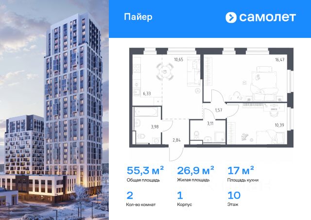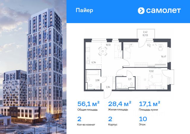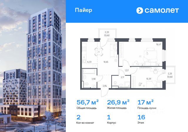 Продаётся 2-комнатная квартира в строящемся доме (Дом 6), срок сдачи: III-кв. 2027, общей площадью 52.1 кв.м., на 6 этаже. Расположение, транспортная доступность