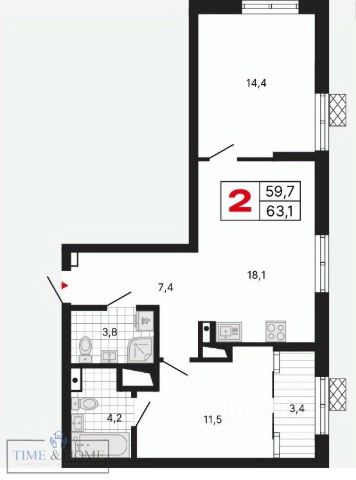 * Три полноценные раздельные комнаты: 17.4 квм, 14.1, квм (с балконом), 13.3 кв.м, просторная кухня - 12 кв.м, санузел совмещен.