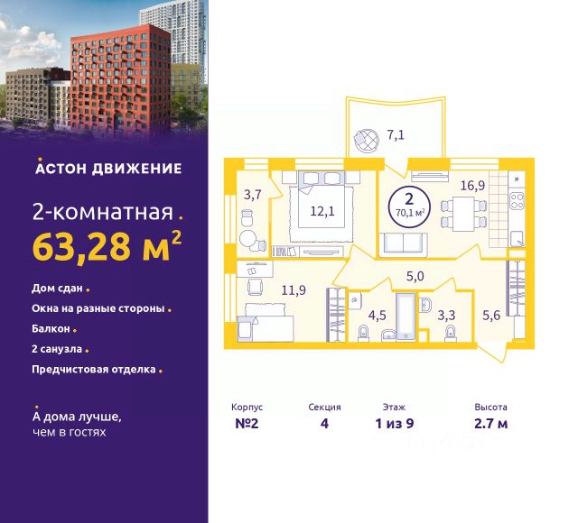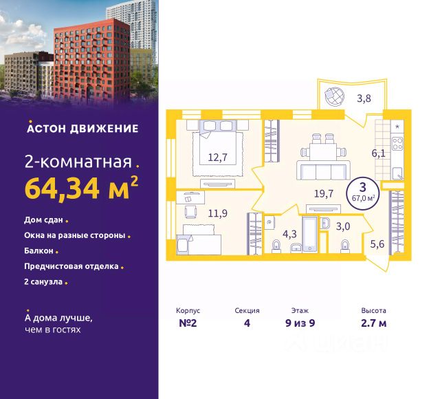 Спешите оформить бронирование по этой цене, срок акции ограничен! Стоимость квартиры указана со скидкой, ваша экономия составит 1,219,112 руб. Информация по телефону, мы вам все подробно расскажем. Двухкомнатная квартира от застройщика с предчистовой отделкой в ЖК "Астон.Движение" на 1 этаже. Общая площадь: 57.4 кв.м., жилая: 21.1 кв.м., площадь просторной кухни-столовой: 19.4 кв.м. Квартира угловая, идеально подойдет любителям тишины и панорамных видов. В квартире один балкон, один совмещенный санузел. Высота потолков 2.7 м. Отделка white box - золотая середина между чистовой и черновой отделкой. В вашей квартире будут выполнены работы: стяжка пола; выровнены и оштукатурены стены; затерты швы на потолке; электроразводка во всех помещениях; полностью готовая система отопления, водопровод и канализация; установлена входная металлическая сейф-дверь. Квартира находится в корпусе 2. Дом монолитный, одноподъездный, высотой 9 этажей. На этаже 10 квартир. В подъезде 1 грузовой лифт. В настоящее время строительство окончено, дом сдан в 4 квартале 2025 года. Оформление сделки по договору купли-продажи. Квартал Астон.Движение расположен в развивающейся части Новой Сортировки, на пересечении улицы Пехотинцев и переулка Проходной. Первая очередь 6 домов разной этажности, детский сад и бульвар с прогулочными аллеями в окружении зелени. В архитектуре отдано предпочтение отдельно стоящим секциям, благодаря чему получилась большая вариативность планировок, много видовых квартир с окнами на разные стороны, а постепенный набор высоты домов позволит наполнить солнечным светом каждую квартиру. Первые этажи домов соединяет большая галерея товаров и услуг для жителей и гостей квартала. Двор обустроен для приятного и неспешного движения. Полностью закрытый, без доступа автомобилей, с плавными линиями прогулочных тропинок. Игровые площадки для малышей и ребят постарше находятся на отдалении друг от друга. А взрослым можно разместиться в уютных беседках, на скамейках со столиками в тени деревьев или заняться спортом в уличном воркауте. В холлы организован безопасный безбарьерный доступ: нет риска получить травму или оступиться. Просторные лобби с современной дизайнерской отделкой, ресепшен, кофе-пойнтами и мягкими зонами наполнены светом и воздухом. Чистовая отделка включает: • В комнатах, коридоре и кухне — ламинат 32 класса на звукоизоляционной подложке. В ванной — напольная керамическая плитка; • Стены покрыты обоями и окрашены. В ванной влагостойкая краска нейтрального цвета; • Потолки зашпаклёваны и окрашены; • Установлены глухие межкомнатные двери одной модели; • Сантехника — раковина, унитаз и ванна. #2mvFsW