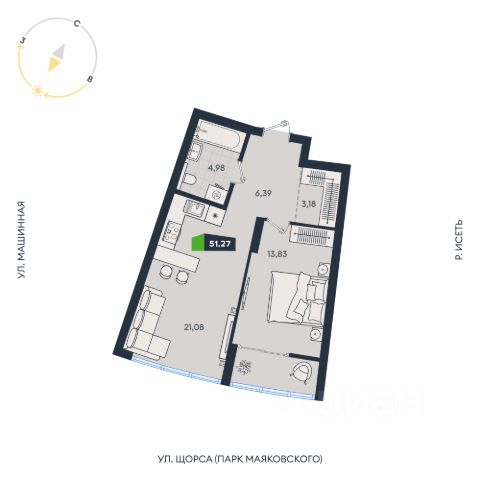 Двухкомнатная квартира в жилом комплексе "Клевер Парк" готова к заселению и сочетает в себе продуманную современную планировку и выгодное расположение. Общая площадь составляет 51,5 м², что включает две полноценные спальни 13,5 м² и 10,5 м², а также просторную кухню-гостиную 18,5 м². Планировка реализована по индивидуальному дизайн-проекту с качественной отделкой, для которой были использованы надежные материалы. Окна спальни и кухни-гостиной выходят в ухоженный, озелененный двор с ландшафтным дизайном, а из одной из комнат открывается вид на Парк Маяковского, вековые деревья и колесо обозрения. Санузел совмещенный, площадью 4,5 м², отделан плиткой и оборудован инсталляцией, предусмотрено место для стиральной машины. Квартира расположена в десятиэтажной секции, что обеспечивает малое количество соседей и комфортную среду.