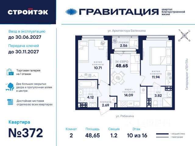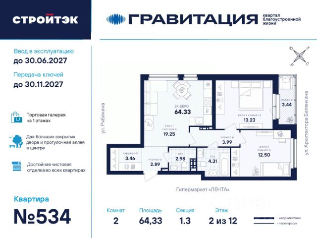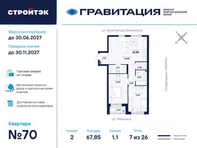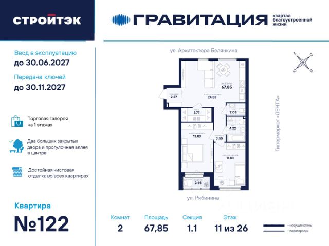 Удачные решения Новый квартал благоустроенной жизни "Гравитация" мы разместили в периметре улиц Рябинина и Академика Ландау. У квартала 5 этапов строительства, а всю работу мы завершим к 2030 году. Авторы проекта гармонично совместили в оформлении природные элементы и современный дизайн. Волнообразные очертания на стенах вдохновлены силой ветра и движением воды. Скруглённые углы подчеркивают элегантный силуэт, а контрастная палитра акцентов и контурная подсветка верхних этажей создают выразительный архитектурный образ. Первый этап строительства: — Секция 1.1 — 1 подъезд 26 этажей — Секция 1.2 — 2 подъезда 16 этажей — Секция 1.3 — 1 подъезд 12 этажей Здесь всё и сразу Гравитация — уютный и обособленный, и в то же время открытый и просторный квартал. Всё рядом: супермаркеты и парки, кино и рестораны, школы и сады. В нескольких шагах набережная реки Патрушихи. В квартале построят муниципальный детский сад на 200 мест, а на 5 этапе строительства мы возведём 6-уровневый надземный паркинг на 250 машин. На первых этажах домов для вас будет работать торговая галерея с магазинами, кафе и привычными бытовыми сервисами. В 1 этапе строительства 631 квартира. Своя вселенная Развитый Академический район удобен и молодым семьям, и школьникам, и состоявшимся профессионалам. Рядом большой Преображенский парк с озером и Юго-Западный лесопарк с Тропой здоровья. — 3 минуты до Гипер Ленты — 10 минут на машине до ТРЦ "Академический", 15 минут до ЕКАД, 25 до центра — 6 школ и 6 детских садов — Спортивные комплексы и клубы Wake up, Bright Fit и Юность Богатые возможности В квартале два просторных закрытых двора общей площадью 1,4 гектара. Один двор объединяет 1 и 2 этапы строительства, другой — 3, 4 и 5 этапы. Между дворами — камерная прогулочная аллея для неспешных вечеров или полуденного отдыха. Во дворе первого этапа — зелёные участки из хвойных деревьев, акцентных кустарников и травянистых многолетников, а также сеть дорожек, детская площадка с песочницей, аттракционами и геопластикой, настольный теннис и зона для зарядки. А для комфорта и безопасности — вечернее освещение, охрана и постоянное видеонаблюдение. Пространство с заботой В просторных светлых лобби Гравитации — интеллигентный дизайн, помещения для колясок, высокие витражи и комфортная мебель. Выходы сквозные, на улицу и во двор. Лифты грузоподъёмностью 1000 и 450 кг. Мы подготовили для вас 44 уникальных варианта продуманных планировок, в том числе с кухнями-гостиными, гардеробными и мастер-спальнями. Здесь нет бесполезных зон, зато есть где посидеть в семейном кругу и разместить всё для удобства и комфорта. Современные технологии Мы позаботились о достойной чистовой отделке, чтобы вы могли уделить время главному. — Виниловые обои на флизелиновой основе, окрашенные стены в санузлах и на лоджиях — Натяжные потолки везде, кроме лоджий, там — окрашенные — Прочный влагостойкий ламинат и керамическая плитка — Межкомнатные двери светлых тонов и сейф-дверь на входе — Эргономичное размещение розеток и выключателей