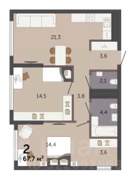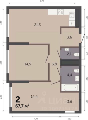 Квартира общей площадью 74 кв. м: удобная кухня - 10,8 кв. м, гостиная - 17,8 кв. м с выходом на балкон, большая спальня - 23,9 кв. м, просторный коридор с прихожей - 15,7 кв. м, санузел раздельный. Высота потолков - 2,77 м.