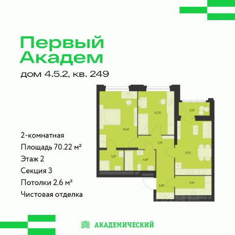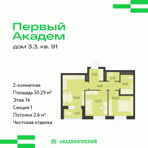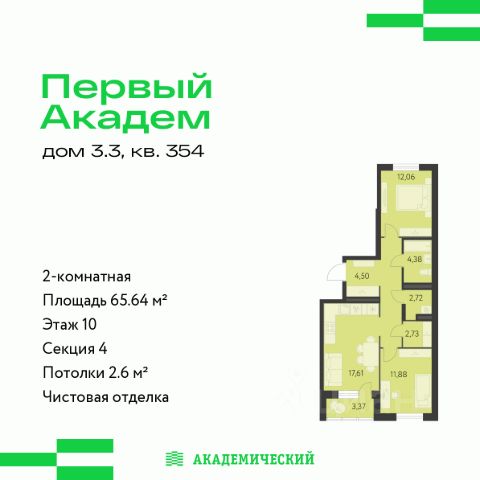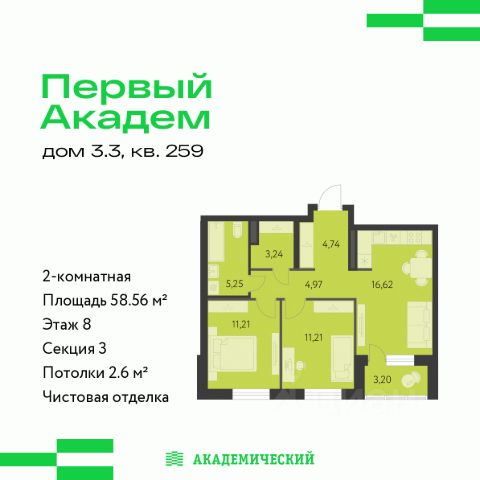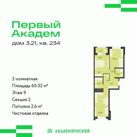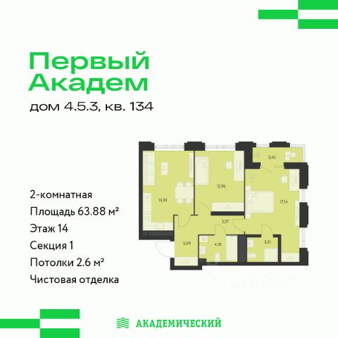 Продается 2-комнатная квартира площадью 56.6 кв.м. от девелопера "Академический" в жилом квартале "Первый Академ". Срок сдачи дома в 2028 году. Выгоды и скидка напрямую от застройщика. Дом расположен на въезде в район, отличается удобной транспортной развязкой. Рядом новая трамвайная линия и остановка общественного транспорта. Эко-тренды во дворах. Холлы и фасады в стиле ар-деко. В продаже имеются квартиры с видом на парк. На территории квартала предусмотрено множество удобств для жильцов, включая видеонаблюдение 24/7, двор без машин, кладовые и подземный паркинг с выходом из лифта, коммерция на первых этажах. В числе особых преимуществ близость к Юго-западному лесопарку и ТРЦ "Академический": магазины, кафе, парк развлечений, кинотеатр, фитнесс-центр с бассейном.