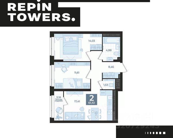 • ✓ В базе Циан 14 2-комнатных квартир в ЖК REPIN TOWERS в Екатеринбурге