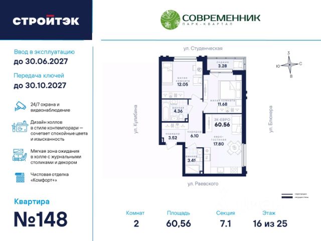 Время жить счастливо Современник — знаковый парк-квартал в интеллигентном районе Втузгородок, откуда недалеко до центра, а вблизи ведущие вузы и театры. Квартал состоит из 8 очередей строительства. Шесть очередей уже сданы и заселены; седьмая строится. В продаже квартиры от застройщика: 1 этап седьмой очереди. Объединяет квартал большой внутренний парк площадью в гектар — богатый прогулочными маршрутами, тенистыми деревьями, пространствами для отдыха, спорта и детских игр. С внешней стороны, у домов седьмой очереди, появится гостевой центр. Проект создавали в KCAP Architects and Planners, архитектурном бюро из Нидерландов, чьи работы украшают ландшафты Гамбурга, Антверпена и других городов Европы. Технологии, продуманное пространство и трендовый облик зданий создают размеренную атмосферу для жизни здесь. Достойное окружение До проспекта Ленина на машине вы доберётесь за 10 минут, а с другой стороны, неподалёку — Шарташский лесопарк с озером Шарташ, которому около миллиона лет. Здесь для вас пляжи, лодочные станции, тропы для бега и кафе. В квартале уже работают супермаркеты, пекарни, салон красоты и не только. Ближние школы, гимназии и университеты помогут расправить крылья новым поколениям, а детские сады станут заботливой средой в начале пути. Кстати, на территории квартала спроектирован муниципальный детский сад на 200 мест. Выходите во двор Гуляйте по зелёным аллеям или устройтесь с книгой в гамаке. Займитесь воркаутом, футболом, баскетболом или пинг-понгом. Проводите семейные праздники под крытым амфитеатром или отправьте детей играть на насыщенный плейхаб. Мы всё предусмотрели. На закрытой территории без машин и посторонних спокойно и безопасно. Видеонаблюдение и освещение добавляют ещё больше уверенности. Впечатляющая доминанта у домов 7 очереди — новый гостевой центр: камерное пространство под навесом-перголой с озеленением и скамейками, чтобы встречать друзей. Ваша зона комфорта Стильное лобби Современника мы выполним в эстетике contemporary: минимализм, сочетание дерева со штукатуркой и тёмным металлом, зеркала, витражи. Обстановка из мягкой мебели, растений и книг. Двери из холла выходят на обе стороны. Внутри — комната для колясок и самокатов. На -1 этаже подземный паркинг с 201 машино-местом, куда легко попасть на лифте прямо с вашего этажа. Здесь же можно приобрести одну из 67 кладовых, чтобы хранить сезонный инвентарь. СТРОЙТЭК возводит 7 очередь в 3 этапа. Дом с привилегиями Первый этап — секция 7.1, башня в 25 этажей. Здесь 246 квартир в 19 уникальных планировках от студий до 3-комнатных, в классических и евро-вариантах. Просторные кухни-гостиные, гардеробные и окна на 2 стороны — лишь часть их плюсов. В Современнике улучшенный стандарт отделки "Комфорт +". Помимо комфортных сантехники и электрики, в него входят оконные стёкла Energy Light, которые помогают сохранять температуру, прочный ламинат 33 класса и устойчивые к многократной покраске виниловые обои. Белые межкомнатные двери и плинтусы подчеркнут любую цветовую гамму. Продам 2-комнатную квартиру 2-комнатных квартир в Современник в Екатеринбурге.