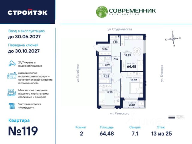 Время жить счастливо Современник — знаковый парк-квартал в интеллигентном районе Втузгородок, откуда недалеко до центра, а вблизи ведущие вузы и театры. Квартал состоит из 8 очередей строительства. Шесть очередей уже сданы и заселены; седьмая строится. В продаже квартиры от застройщика: 1 этап строящейся 7-й очереди. Объединяет квартал большой внутренний парк площадью в гектар — богатый прогулочными маршрутами, тенистыми деревьями, пространствами для отдыха, спорта и детских игр. С внешней стороны, у домов седьмой очереди, появится гостевой центр. Проект создавали в KCAP Architects and Planners, архитектурном бюро из Нидерландов, чьи работы украшают ландшафты Гамбурга, Роттердама, Антверпена и других городов Европы. Современные технологии, продуманное пространство и трендовый облик зданий создают размеренную и счастливую атмосферу для жизни здесь. Достойное окружение До проспекта Ленина на машине вы доберётесь за 10 минут, а с другой стороны, неподалёку — Шарташский лесопарк с озером Шарташ, которому около миллиона лет. Здесь для вас пляжи, лодочные станции, тропы для бега, спортивные площадки и кафе. В квартале уже работают супермаркеты, пекарни, салон красоты и не только. Ближние школы, гимназии и университеты помогут расправить крылья новым поколениям, а детские сады станут заботливой средой в начале пути. Кстати, на территории квартала спроектирован муниципальный детский сад на 200 мест. Выходите во двор Гуляйте по зелёным аллеям или устройтесь с книгой в гамаке. Займитесь воркаутом, футболом, баскетболом или пинг-понгом. Проводите семейные праздники под крытым амфитеатром или отправьте детей весело играть на насыщенный плейхаб. Мы всё предусмотрели. На закрытой территории без машин и посторонних спокойно и безопасно. Видеонаблюдение и освещение добавляют ещё больше уверенности. Впечатляющая доминанта у домов 7 очереди — новый гостевой центр: камерное пространство под навесом-перголой с озеленением и скамейками, чтобы встречать друзей или просто коротать вечер. Ваша зона комфорта Стильное лобби Современника мы выполним в эстетике contemporary: минимализм, сочетание дерева со штукатуркой и тёмным металлом, зеркала, витражи. Обстановка из мягкой мебели, растений и книг. Двери из холла выходят на обе стороны. Внутри — специальная комната для колясок и самокатов. На минус первом этаже подземный паркинг с 201 машино-местом, куда легко попасть на лифте прямо с вашего этажа. Здесь же можно приобрести одну из 67 кладовых, чтобы хранить сезонный инвентарь и крупную технику. СТРОЙТЭК возводит 7 очередь в 3 этапа. Дом с привилегиями Первый этап — секция 7.1, отдельная башня в 25 этажей. Здесь 246 квартир в 19 уникальных планировках от студий до 3-комнатных, в классических и евро-вариантах. Просторные кухни-гостиные, гардеробные и окна на 2 стороны — лишь часть их плюсов. В Современнике улучшенный стандарт отделки "Комфорт +". Помимо привычных комфортных сантехники и электрики, в него входят оконные стёкла Energy Light, которые помогают сохранять комфорт Продам 2-комнатную квартиру в ЖК Современник в Екатеринбурге.