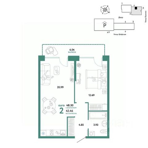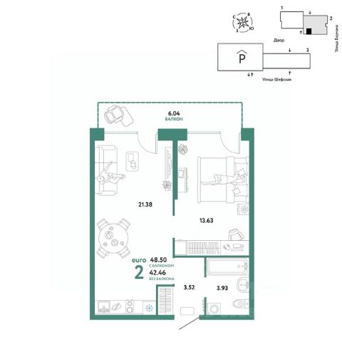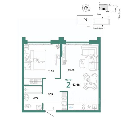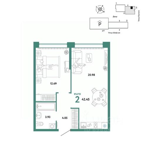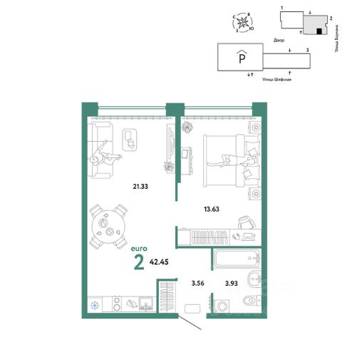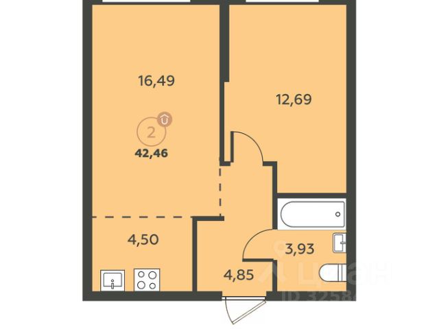 Общая площадь 42,46 квм, просторная кухня-гостиная 21квм и спальня 13квм.