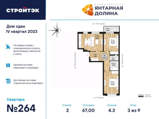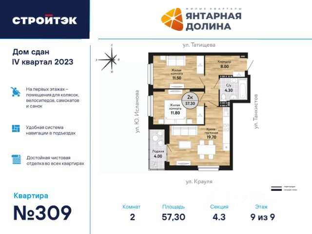 ЖК "Янтарная долина", дом 4 Жилой квартал "Янтарная долина" расположен в районе Новый Виз на улице Крауля, вблизи Верх-Исетского пруда. Предлагаем вам готовые квартиры в доме 4: он уже сдан. Чистый воздух, акватория с яхтами и быстрая дорога до центра — здесь вас ждут все слагаемые комфортной жизни. В их числе — безопасный двор, просторные подъезды и чистовая отделка в каждой квартире. Район В Новом Визе городской комфорт сочетается с зелёной природой. Это одно из самых перспективных направлений в Екатеринбурге. 5 минут пешком до остановки транспорта 3 минуты на машине до "Леруа Мерлен" 15 минут хода до набережной Верх-Исетского пруда 10 минут на машине до центра города 12 минут на машине до "МЕГИ" Двор В центре жилого квартала — двор для насыщенной жизни, игр и отдыха. Концепция "Двор без машин", когда можно заехать только для разгрузки и погрузки Детские площадки для разного возраста, футбол и уличный баскетбол Вместительная наземная парковка вокруг дома Закрытая территория с пропускной системой Круглосуточное видеонаблюдение и освещение территории Подъезды Подъезд в "Янтарной долине" — яркое и светлое пространство, от которого становится приятно, даже если вы ещё не вошли. Доступ в подъезды на уровне земли — без барьеров Домофоны — в тёплых остеклённых тамбурах В каждом подъезде — вместительный лифт Помещения для колясок и самокатов на 1 этаже Удобная навигация с номерами этажей и квартир Планировки Наш подход к проектированию квартир называется "Разумные метры". Это значит не только исходить из площади, но и учитывать число жильцов и их потребности. Объединённые кухни-гостиные для простора и общения 3D-модели с вариантами обстановки В зависимости от вашего стиля жизни — по несколько вариантов планировок студий, однушек, двушек и трёшек Отказ от бесполезных "мёртвых" зон 22 уникальных планировки Отделка В каждой квартире "Янтарной долины" мы позаботились о чистовой отделке, чтобы ваш переезд прошёл быстро и не вызвал лишних хлопот. Прочный водостойкий ламинат на полу в комнатах, прихожих и кухнях, плитка в санузлах, на стенах виниловые обои на флизелиновой основе, белые натяжные потолки Межкомнатные двери и усиленная сейф-дверь на входе в квартиру В санузлах установлены раковины и унитазы, а во всей квартире — розетки и выключатели Радиаторы с терморегуляторами и горизонтальной разводкой, двухкамерные стеклопакеты с приточными клапанами вентиляции Телеметрические счётчики на свет, тепло и воду Продается 2-комнатная квартира в ЖК Янтарная Долина в Екатеринбурге.
