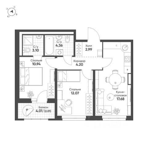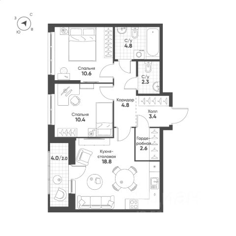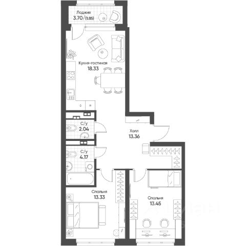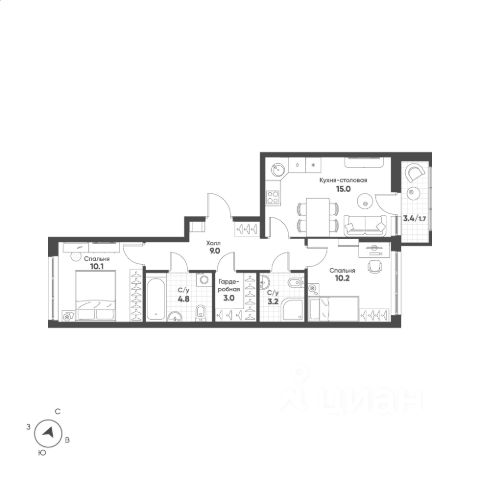 Полноценная двушка с большой кухней - гостиной, гардеробной и двумя санузлами, потолки 2,7м, большая лоджия, горизонтальная разводка, счётчики на всё!