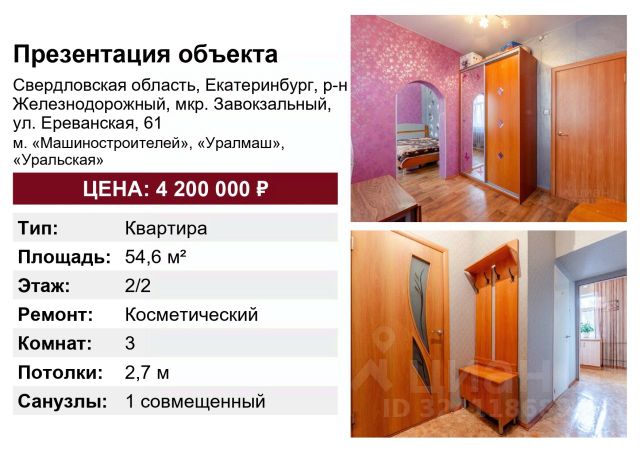 Продаётся трехкомнатная квартира общей площадью 55,3 кв.м., расположенная по адресу: Свердловская область, г. Березовский, ул. Энергостроителей, д. 9, корп. 1 Количество комнат: 3 Этаж/этажность: 4/5 Тип дома: панельный Материал перекрытий: железобетонные Год постройки: 1988 Общая площадь: 55,3 кв.м. Жилая площадь: 35,28 кв.м. Площадь кухни: 7 кв.м. (указана ориентировочно, данные отсутствуют) Санузел: раздельный Наличие балкона/лоджии: нет Наличие лифта: нет Инженерные коммуникации: есть В шаговой доступности находится школа, детский сад, аптека, магазины, парк, поликлиника, отделение Банка. Существующие обременения: в квартире зарегистрированы и проживают 3-и лица. Потребуется процедура выселения через суд. Способ продажи: прямая продажа, покупка за счет собственных средств, кредитных средств. Сделка может быть зарегистрирована с использованием сервиса электронной регистрации. Условия реализации можно уточнить по телефону. Продам 3-комнатную квартиру до 4 млн. рублей в Березовском.