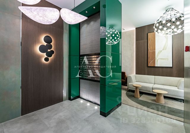 Интерьер вестибюля с кофейней, камином и панорамными видами выполнен в благородных приглушенных тонах с авторским панно из мозаики.