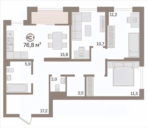 - три уютных спальни площадью 21,8 м2, 17,3 м2 и 13,3 м2,
