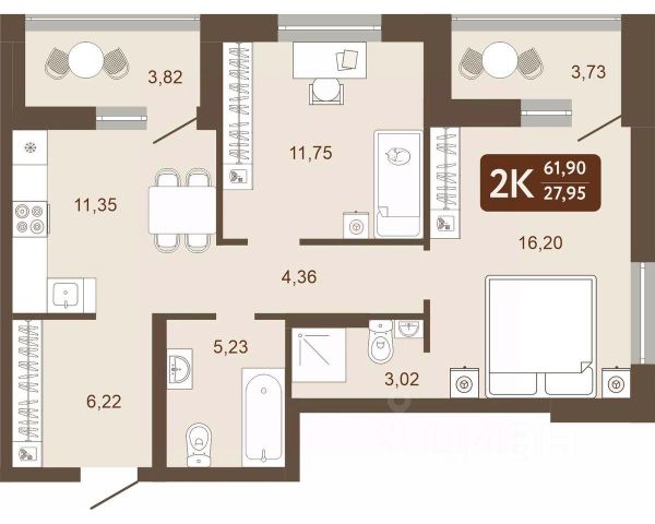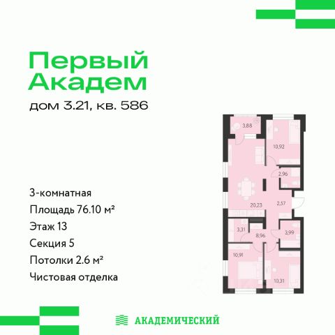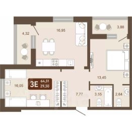 - Эргономичная планировка: просторная прихожая с изолированной входной зоной и нишей с гардеробным шкафом, кухня 11 кв.м, гостиная с выходом на остекленную лоджию, 2 жилые комнаты комфортных размеров 14-15 кв.м, 2 санузла;