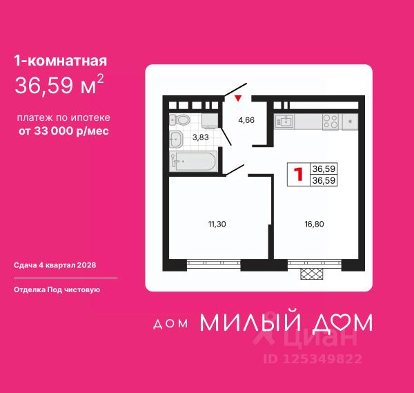Однокомнатная квартира от застройщика с предчистовой отделкой в ЖК "Милый дом" на 15 этаже. Общая площадь: 36.59 кв.м., жилая: 11.3 кв.м., площадь просторной кухни-столовой: 16.8 кв.м. Все окна выходят на одну сторону. В квартире один совмещенный санузел. Высота потолков 2.7 м.