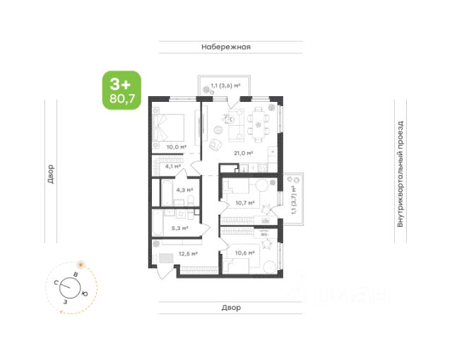 Квартира расположена на седьмом этаже, с высокими потолками.