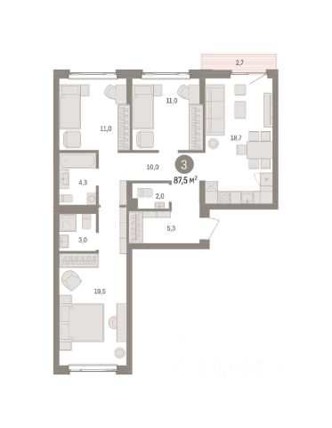 Продается 3-комн. квартира с предчистовой отделкой в ЖК "Квартал Траектория" на 5 этаже. Общая площадь: 87.5 кв.м., жилая: 41.5 кв.м., площадь просторной кухни-столовой: 18.7 кв.м. Квартира - распашонка, без проходных комнат, окна выходят на paзные стороны дома. В квартире один балкон, два совмещенных санузла. Высота потолков 2.82 м.